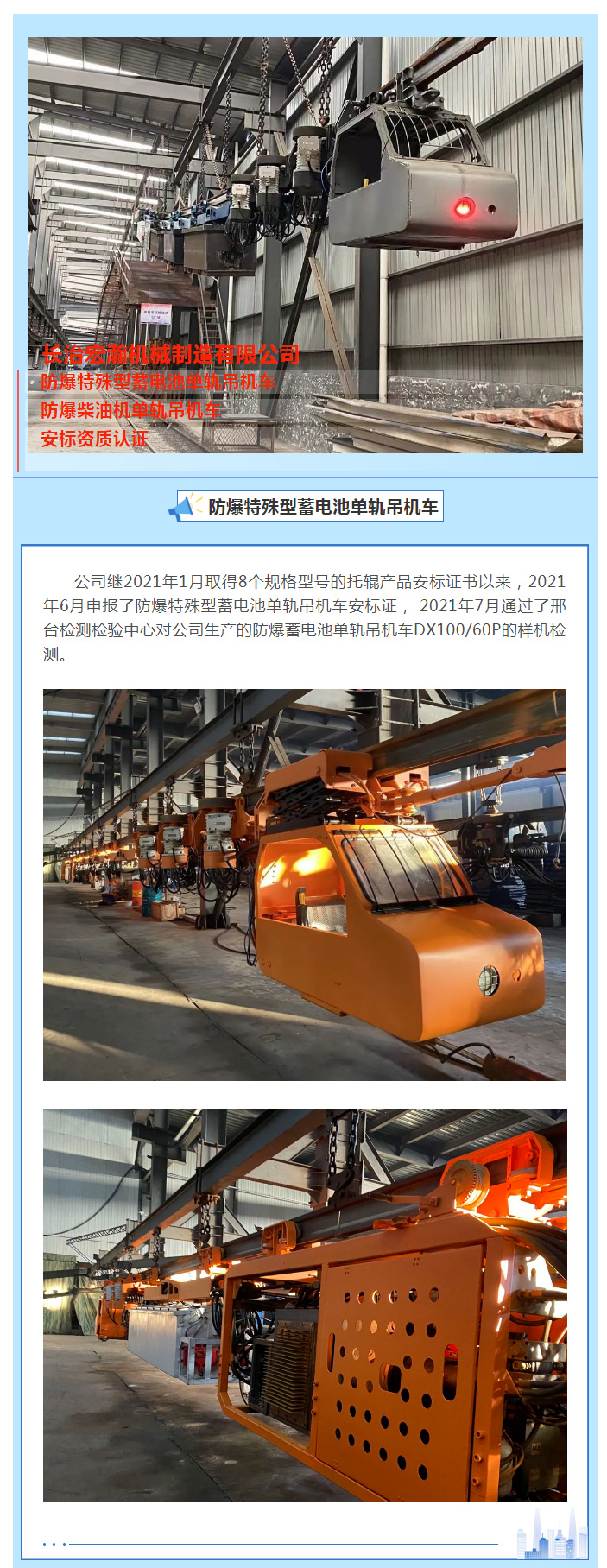 賀:長(zhǎng)治宏瀚機(jī)械有限公司取得7個(gè)單軌吊機(jī)車(chē)產(chǎn)品的安標(biāo)證書(shū)